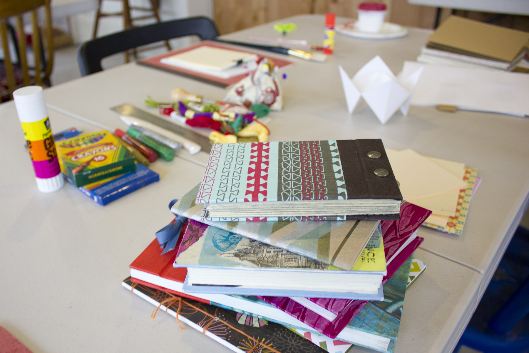 In April we had an awesome Bookmaking Fun! kid’s workshop. Each child learned a bunch of fun folds and some simple ways to sew up a book. Personalizing and decorating the book covers was definitely the highlight of the day! I’m sad we were so busy playing that we didn’t get many pictures of the finished products.