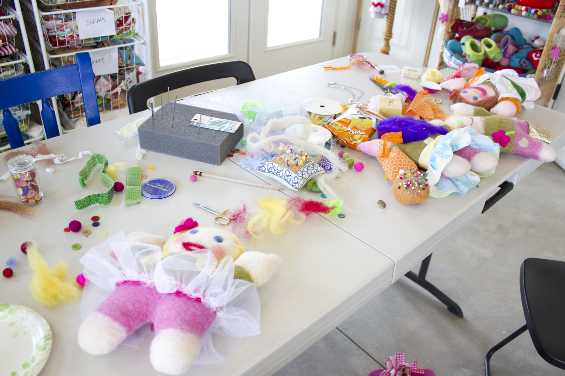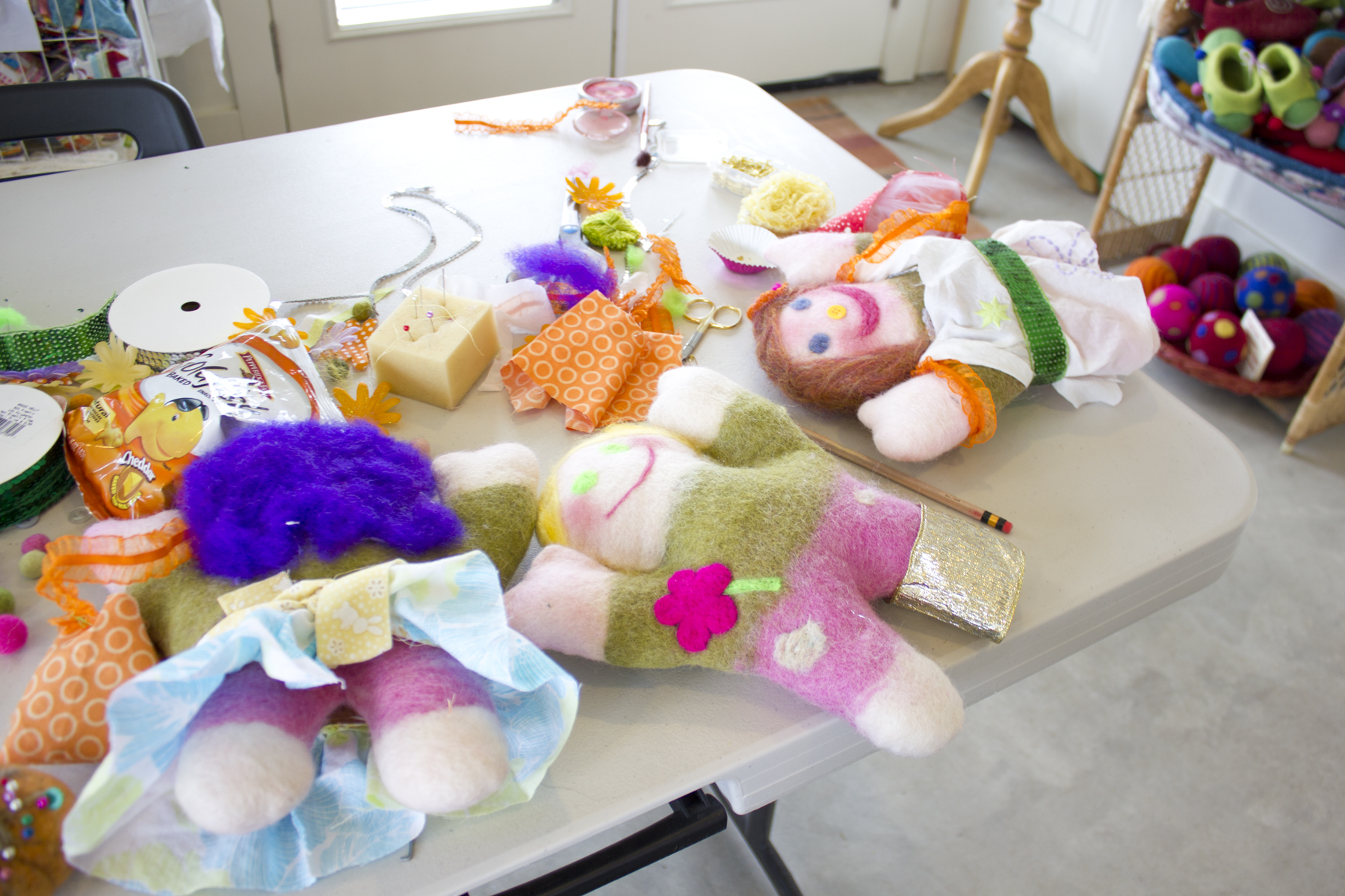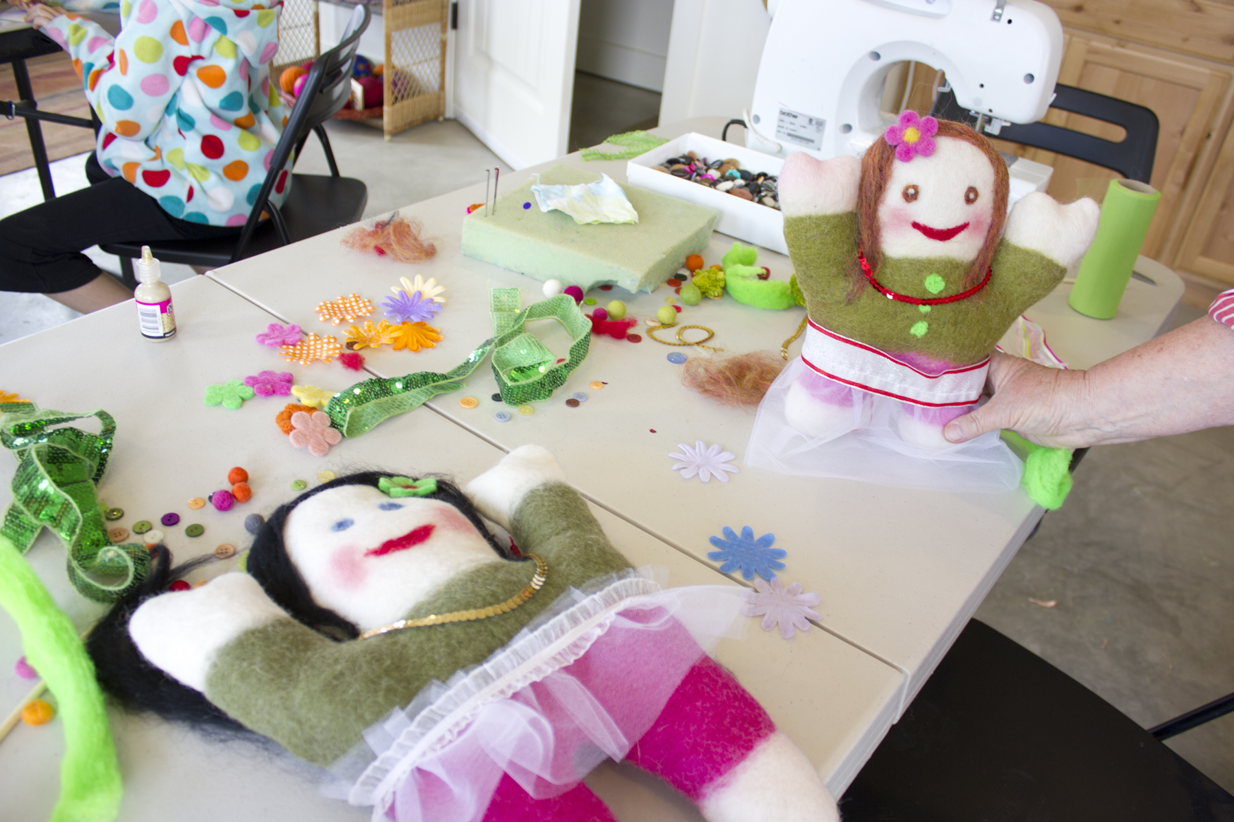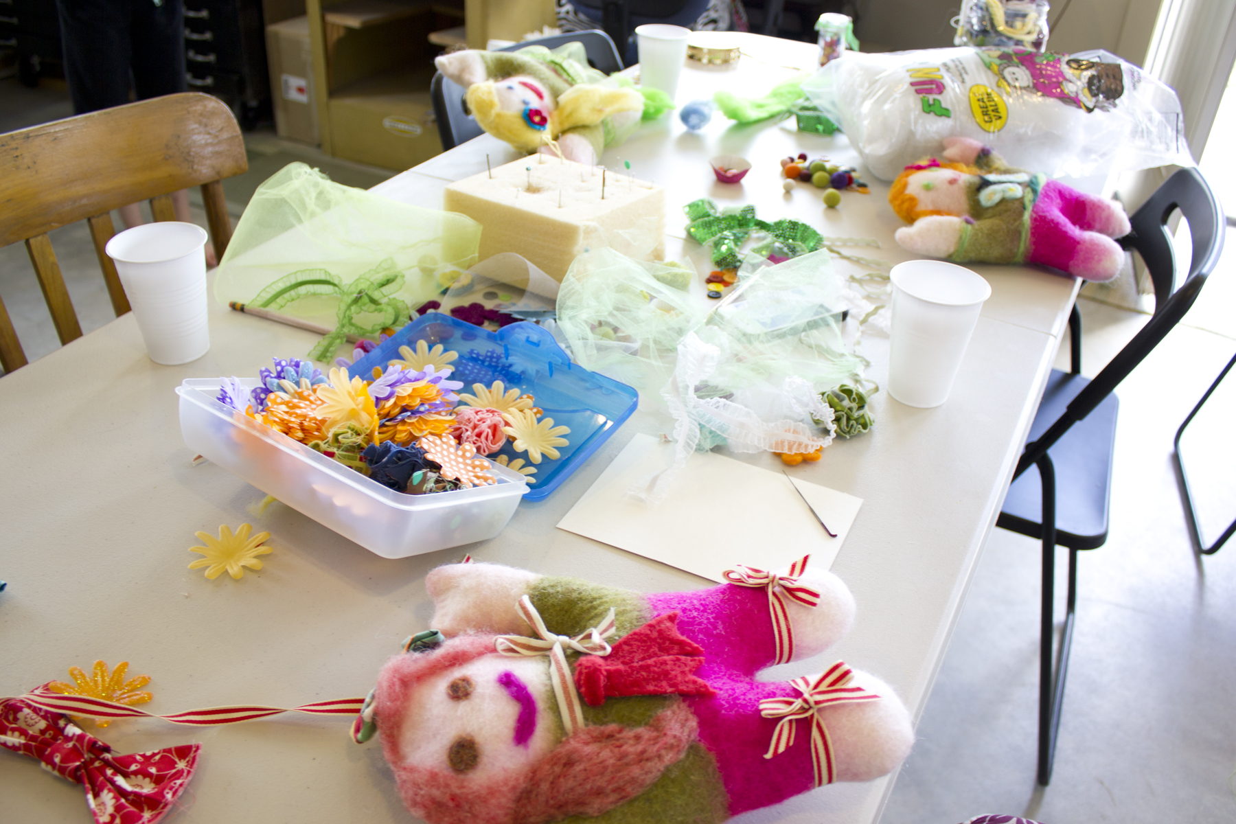 In March we were able to host a felted doll birthday party. Each girl was able to stuff and then decorate their doll. They learned how to needle felt wool roving to create their own unique doll! They made clothes from fabric scraps and tulle and had a blast giving their dolls fun accessories – sequin belts and headbands, purses, flowers, buttons, bracelets etc. We were cracking up at all the outfits!