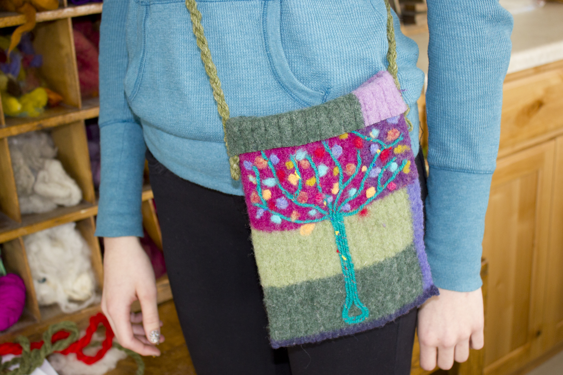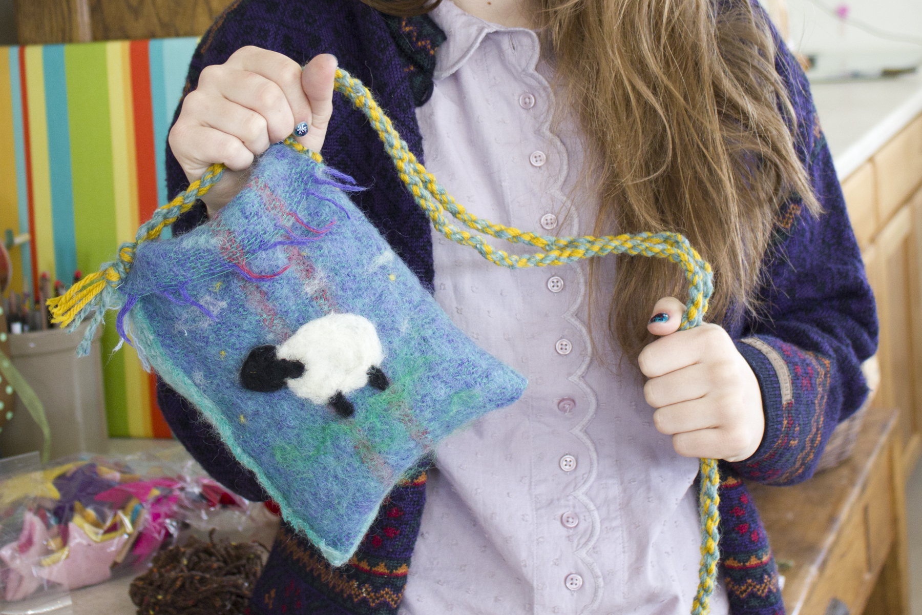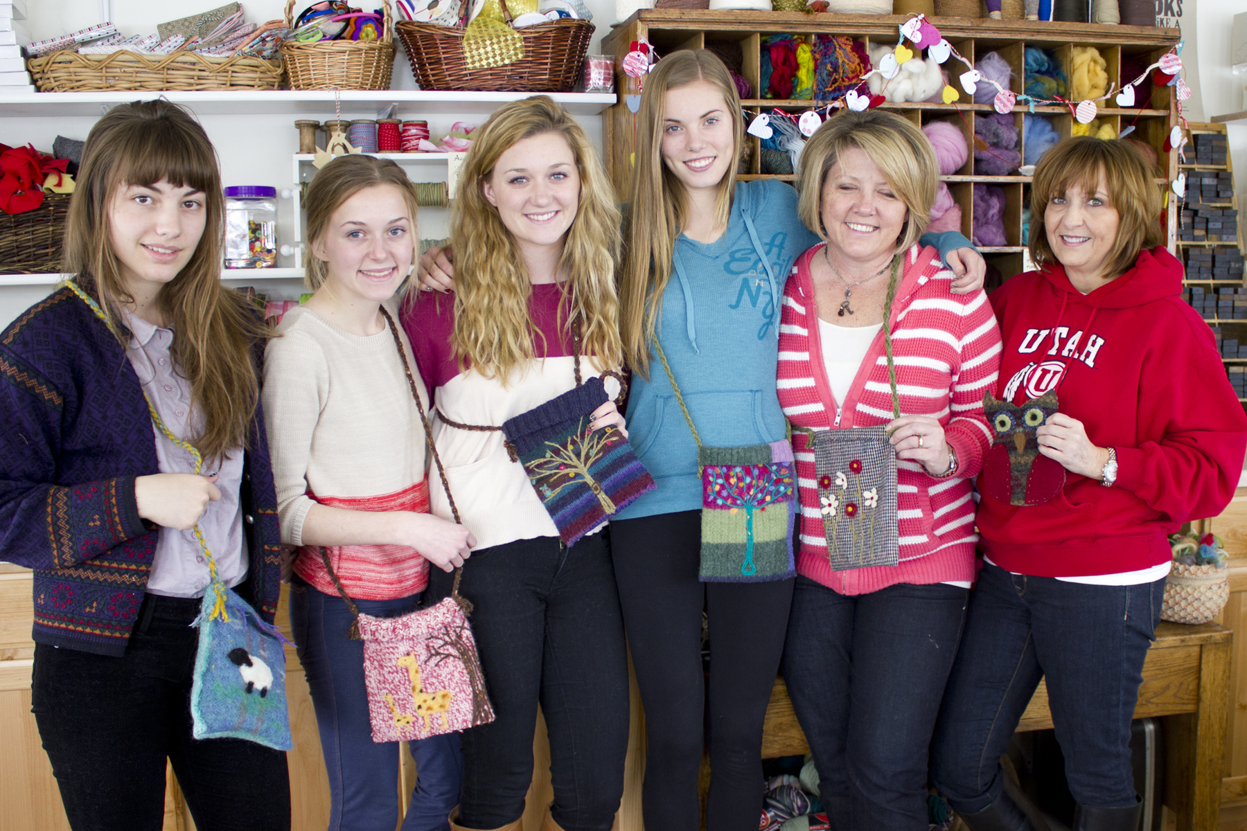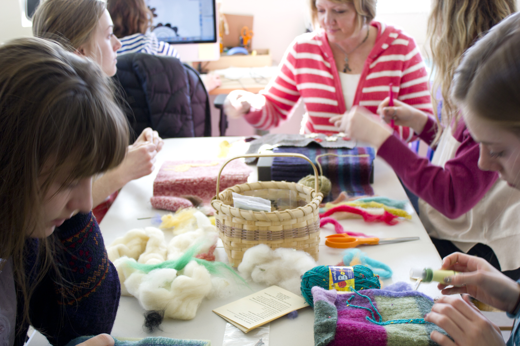 We had a great time teaching this cute group of girls how to make felted purses! This intro to felting class covered the basics of needle felting and the girls got to raid Nancy’s stash of upcycled wool sweaters and wool roving. She even taught them her favorite trick – how to twist wool yarn into a perfect purse strap! We loved seeing all the fun designs and each gal got to take home a one-of-a-kind purse!