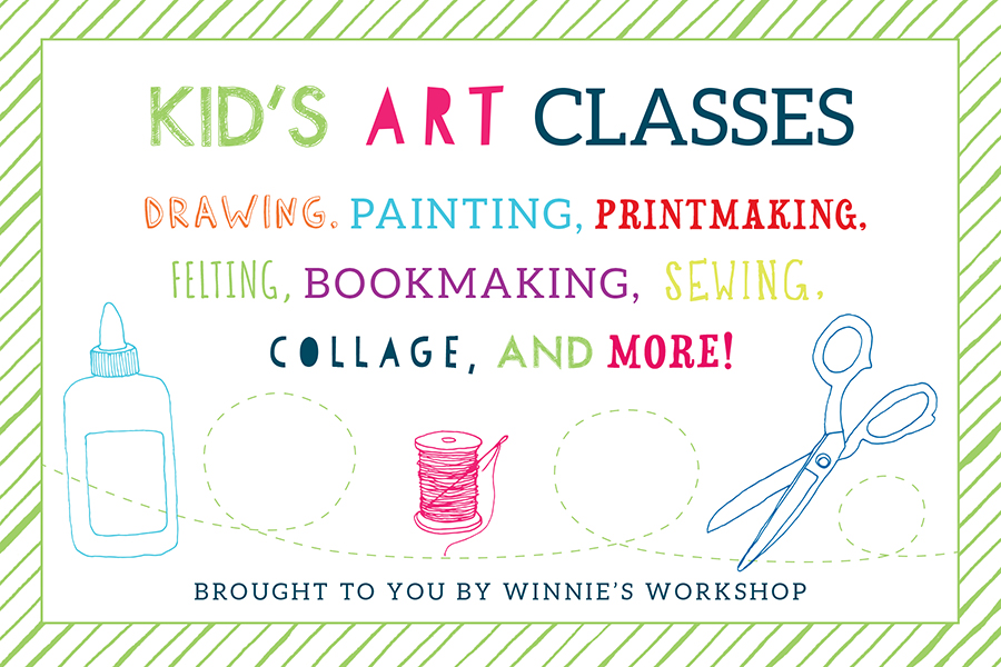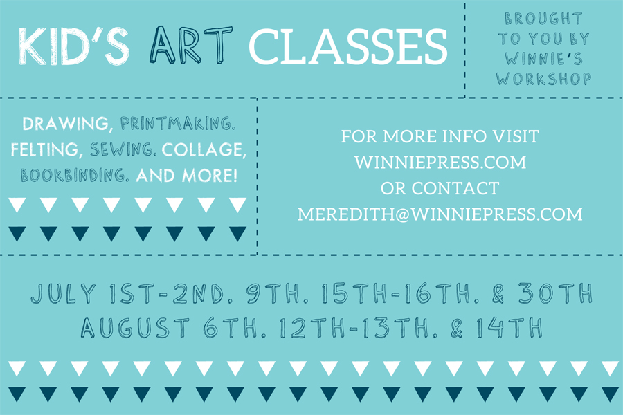 Summer is here and our Winnie’s Workshop classes are back! We are so excited to offer kid’s art and sewing classes this July and August! We are offering Sewing, Art, Mixed Media + Bookmaking, Drawing + Printmaking (we have two sessions of the printmaking class – one for older kids and one for younger), and everyone’s favorite Felting! Click here to find out more info or check out the Kid’s Classes section under our Classes tab. Email meredith@winniepress.com with questions or to sign up!